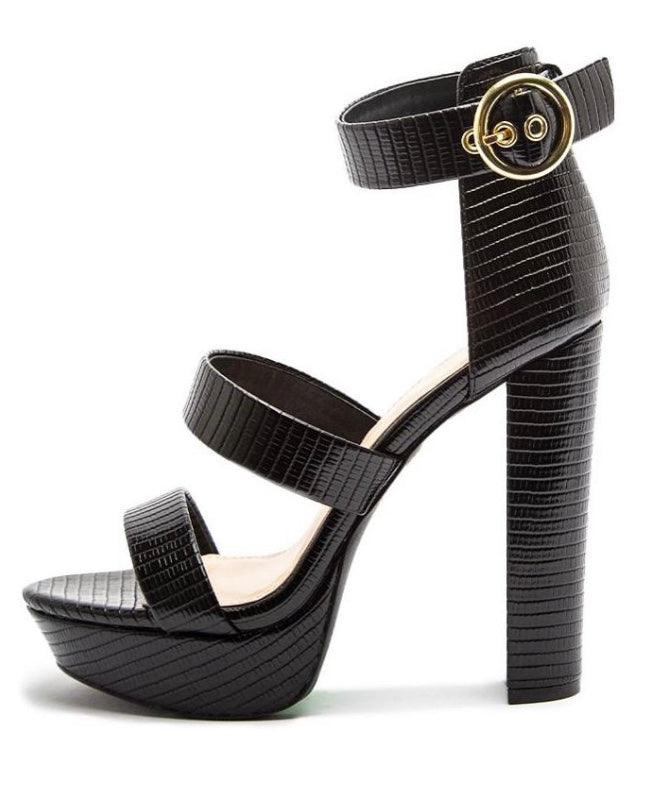 Black lizard print women's block heels with a gold buckle around ankle strap